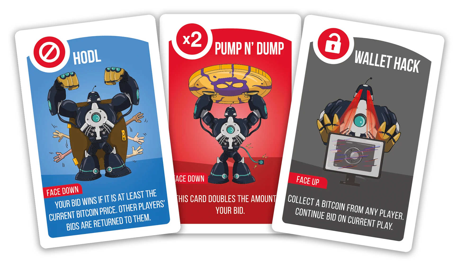 Stack the odds in your favour by using special cards like: blocking bids, pumping bids, stealing bitcoin and more.